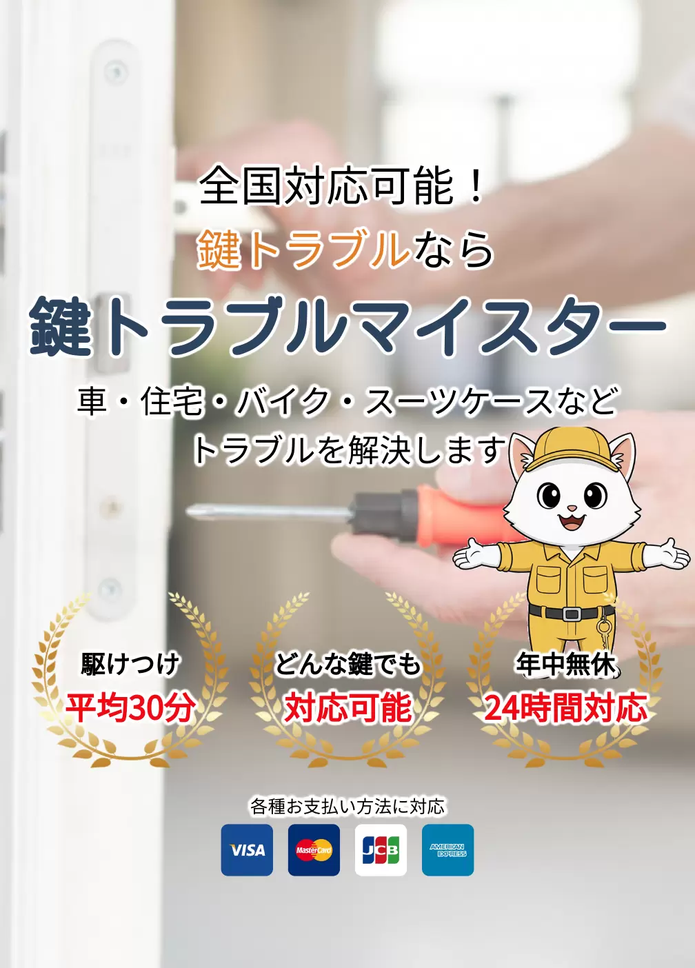 急な鍵のトラブルにもスピーディーに対応いたします。お問い合わせから現場到着まで平均30分で対応し、トラブルをスムーズにサポートします。